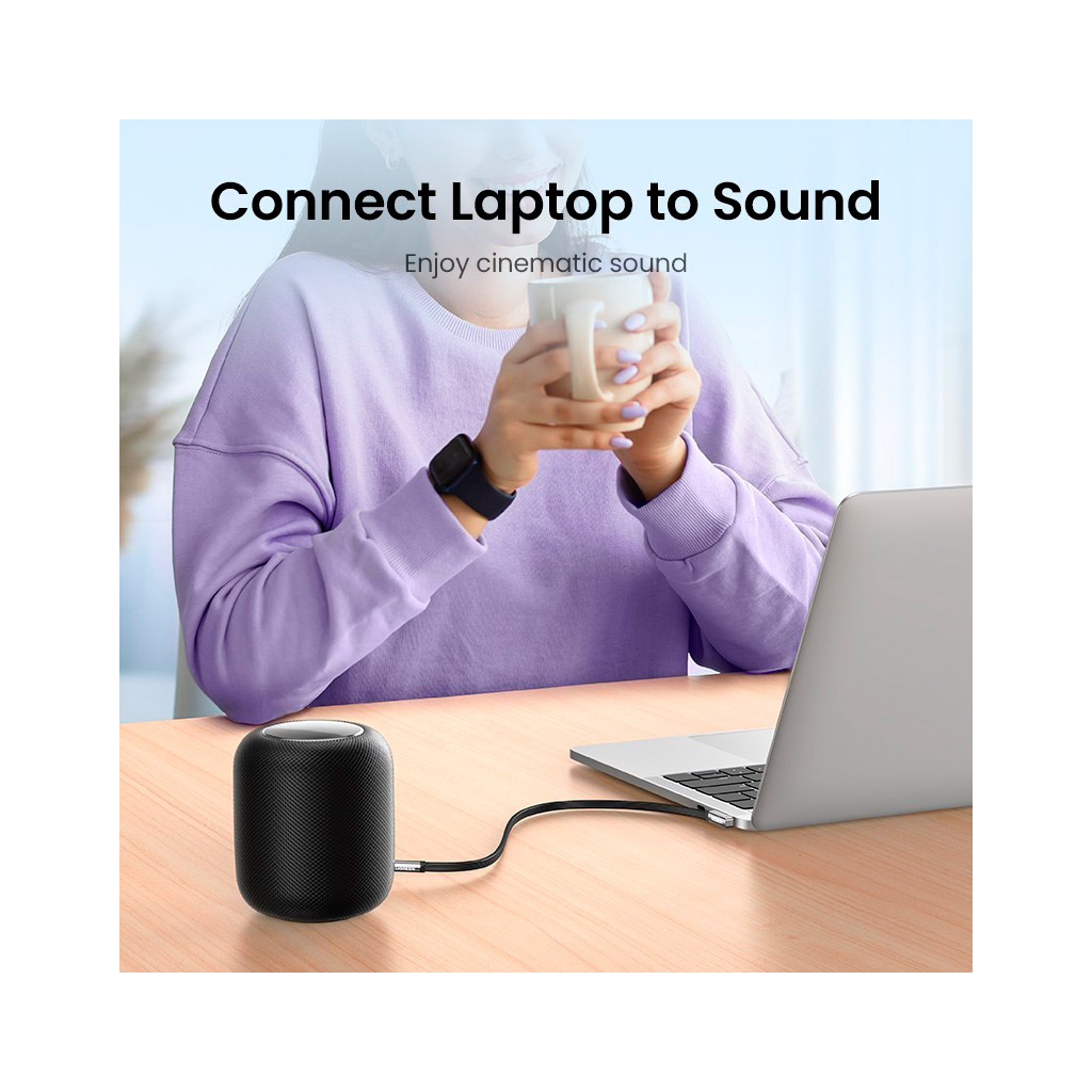 Впечатляющий кабель аудиокабель Ugreen Right Angle 3.5 мм передает список воспроизведения с устройства с дополнительным выходом (линейным выходом) на устройство с дополнительным входом (линейным входом), например, с телефона Samsung/Huawei на наушники, со смарт-ТВ на динамик Hi-Fi, с iPod на автомобильное стерео радио.