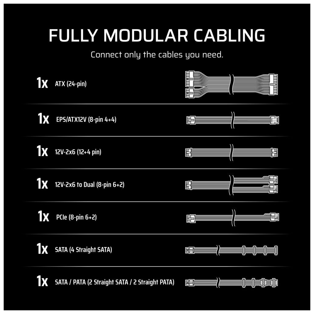 Повністю модульні низькошумні блоки живлення CORSAIR серії RMe оснащені спеціальним кабелем живлення 12 В-2x6 для графічного процесора, мають сертифікат ATX 3.1 і відповідають стандарту PCIe 5.1, а також мають ефективність Cybenetics Gold, що забезпечує тиху і надійну роботу. Компактний розмір блоків живлення RMe також полегшує керування кабелями.