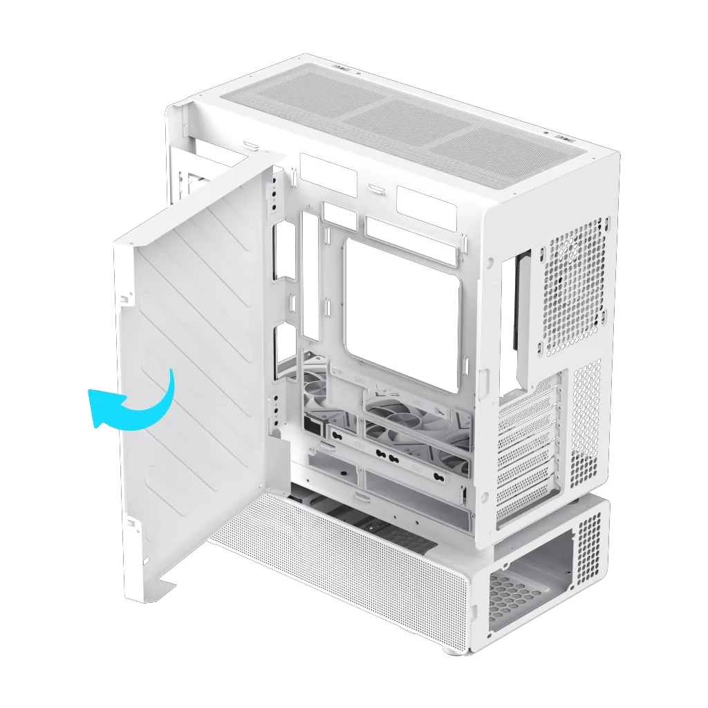 Прежде всего, Gamemax N80 WH выделяется модульным дизайном, что позволяет легко обновлять и настраивать систему под ваши потребности. Его внешний вид, выполненный в белом цвете, придает корпусу изысканную эстетику. Установленное изогнутое стекло на передней панели не только добавляет стиля, но и позволяет продемонстрировать все компоненты с их эффектной подсветкой.