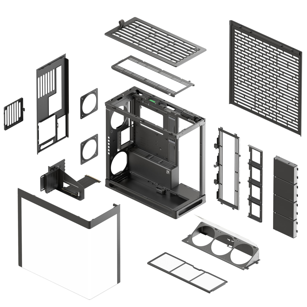 Корпус имеет инновационный дизайн с термоформованной стеклянной панелью UniSheet, которая открывает захватывающий панорамный вид на все ваши компоненты, подчеркивая их эстетику. Гибкая резина на кронштейнах вентиляторов обеспечивает изоляцию от корпуса, предотвращая создание резонанса и лишних шумов.