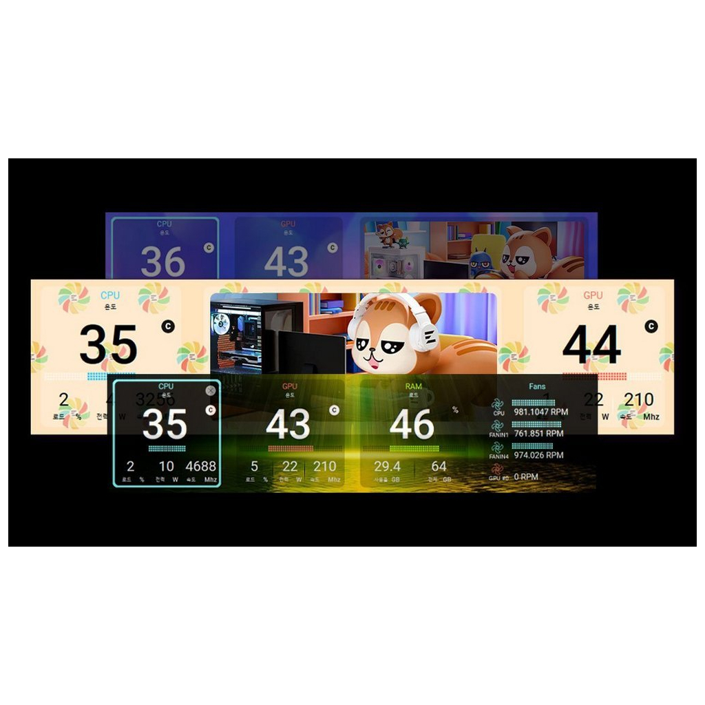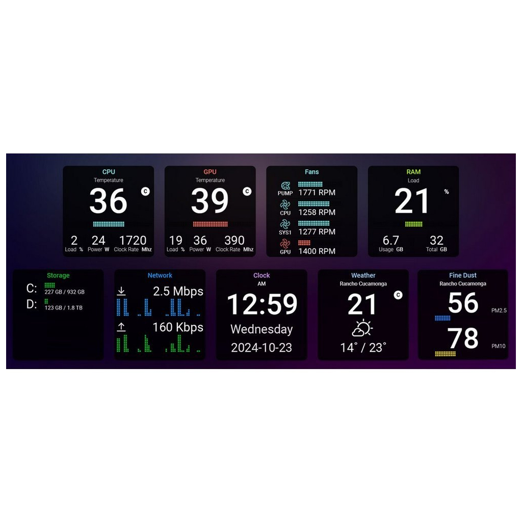 На боковой панели размещён дисплей с разрешением 1920х462, что облегчает мониторинг компонентов в реальном времени, включая процессор, видеокарту, память и вентиляторы с программным обеспечением, которое можно загрузить с официального сайта производителя.