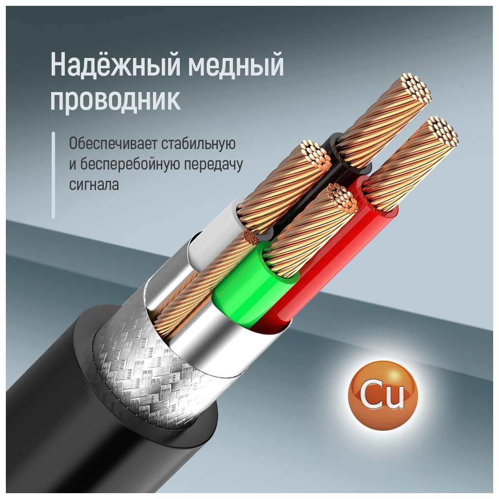 Медный проводник гарантирует надежный сигнал без потерь, а прочная и гибкая ПВХ оболочка защищает кабель от повреждений, перегибов и износа, обеспечивая долговечность даже при частом использовании.