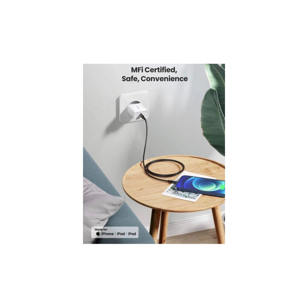 Это универсальный кабель для зарядки и передачи данных от бренда UGREEN, предназначенный для подключения устройств Apple с разъемом Lightning (iPhone, iPad, AirPods и др.) к источнику питания или компьютеру с USB‑C‑портом.