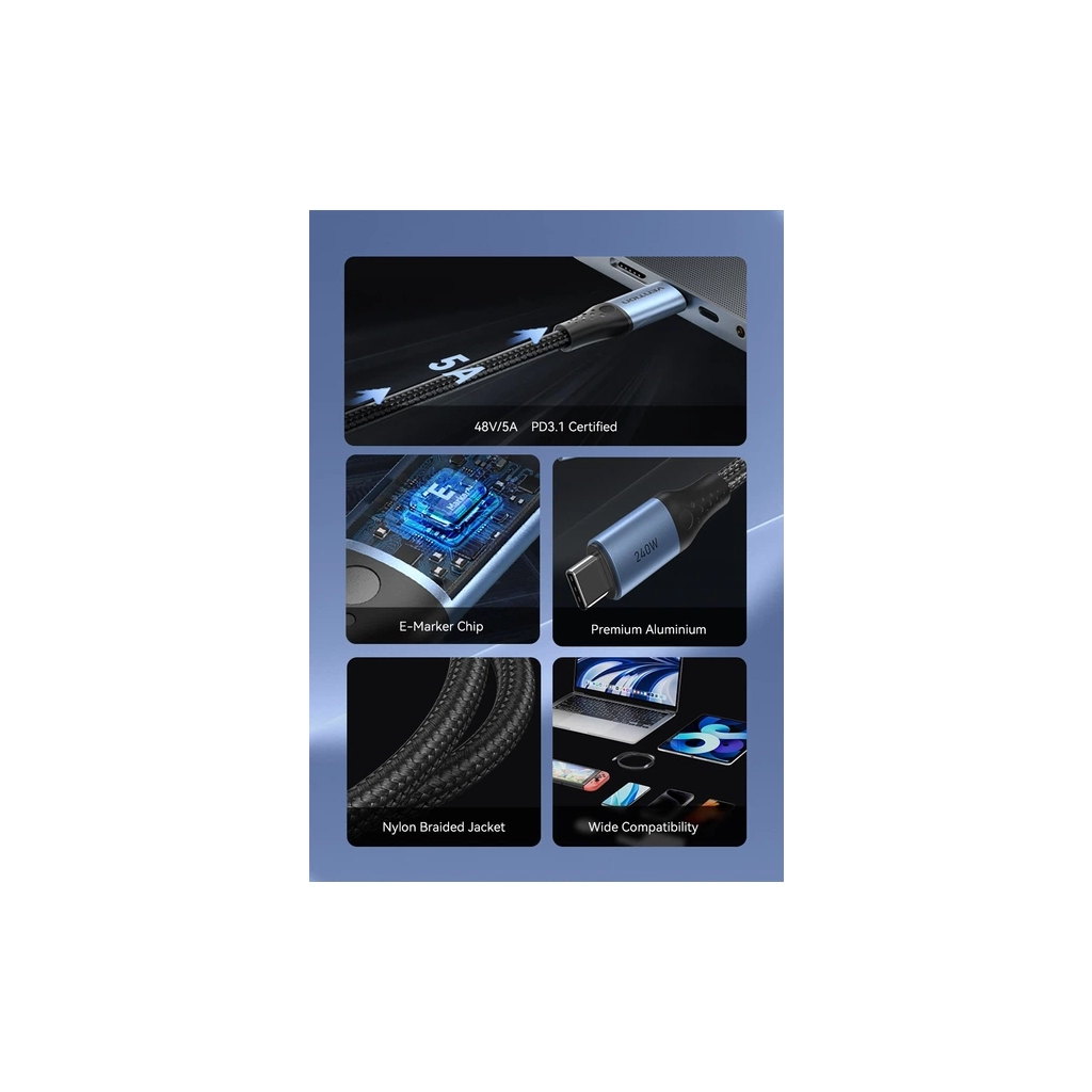 Этот кабель позволяет заряжать устройства и передавать данные на скорости USB 2.0 (480 Мбит/с), но не поддерживает вывод видеосигнала или подключение мониторов. Чтобы использовать полную зарядную способность 240 Вт, и подключенный адаптер питания и устройство должны поддерживать протокол PD 3.1 со спецификацией 48 В/5 А, иначе скорость зарядки адаптируется к максимальным ограничениям используемого оборудования. Кабель оснащен коннекторами USB-C на обоих концах, что означает, что он несовместим со стандартными зарядными сетевыми устройствами USB-A и требует порта USB-C для подключения.