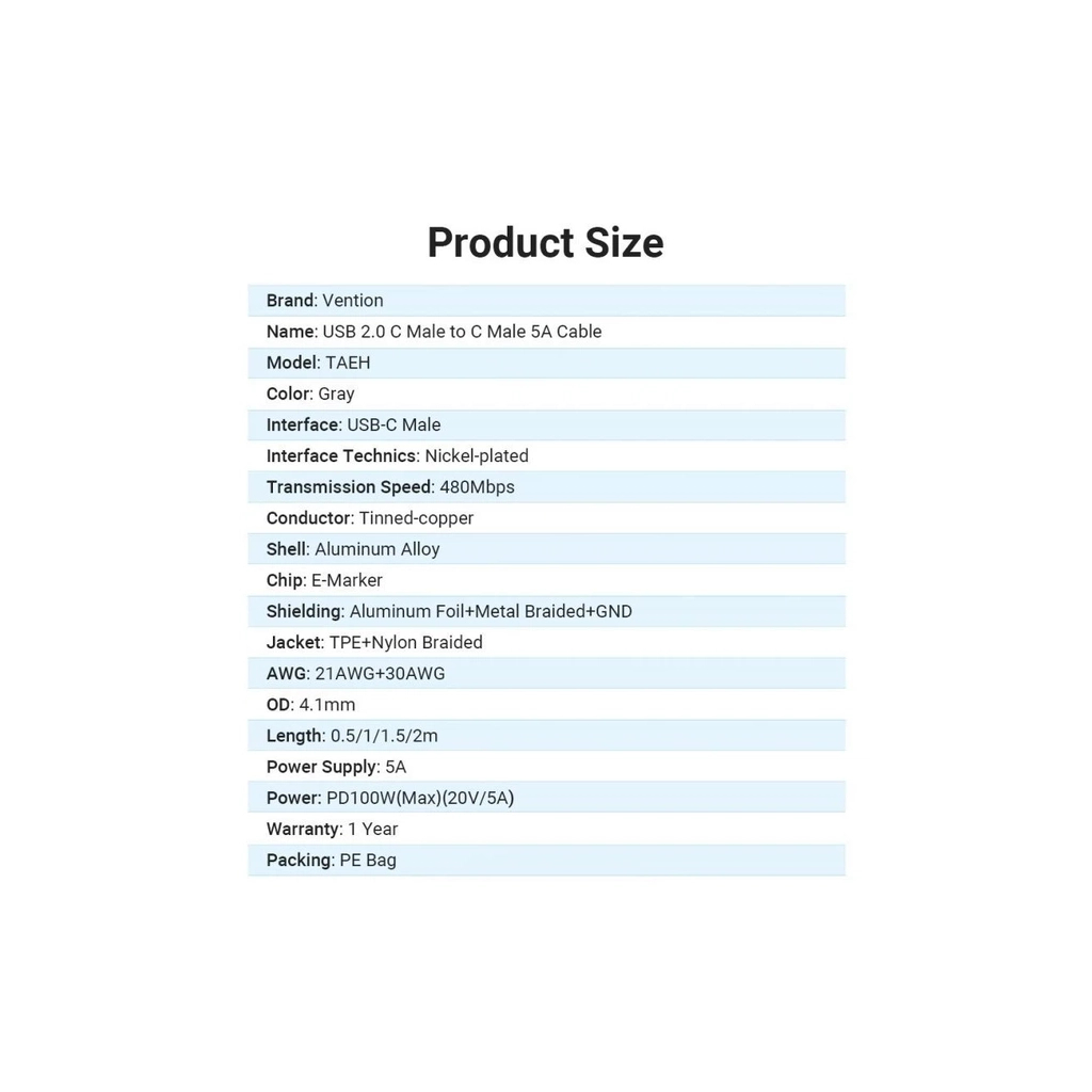 Дата кабеля USB-C to USB-C 2.0m 5A алюминиевый серый VENTION (TAEHH)