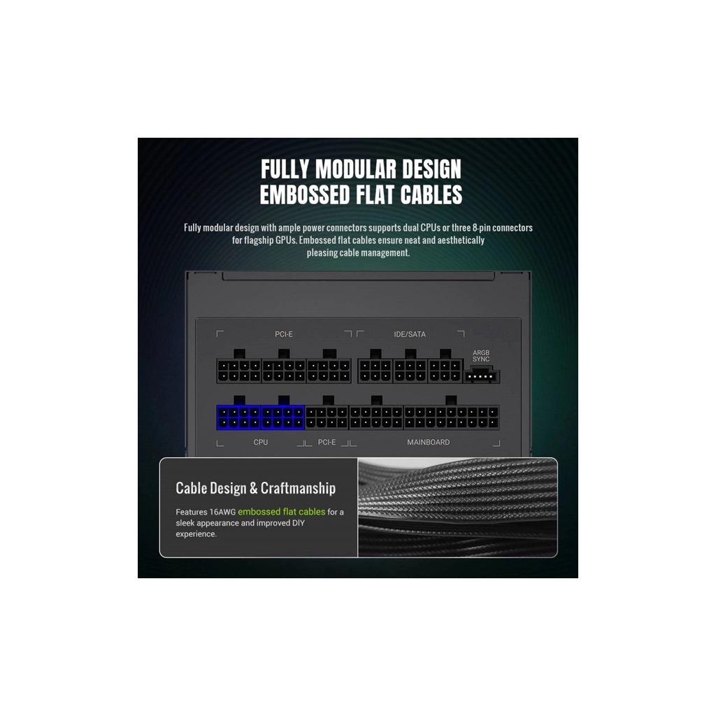 Gamemax 1050W (RGB 1050G) пропонує безліч опцій для підключення: 24+8 pin для материнської плати, 2x4+4pin для процесора, і 4x 6+2pin — для підключення до чотирьох відеокарт, що робить його ідеальним для побудови потужних ігрових систем або робочих станцій. Для підключення накопичувачів є 10 роз'ємів SATA і 3 роз'єми Peripheral.