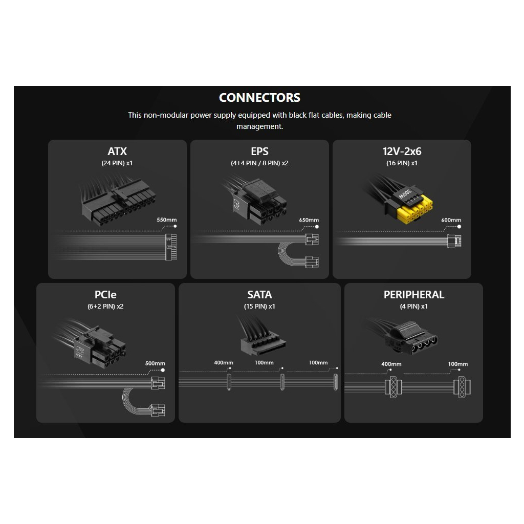 ATX, 650 Вт, CPU - 2x4+4pin, GPU - 2x(6+2pin), 1х16pin (Gen 5), SATA - 3, Peripheral - 2, +12V1 - 54А, 1x120 мм, 150 х 140 х 86 мм