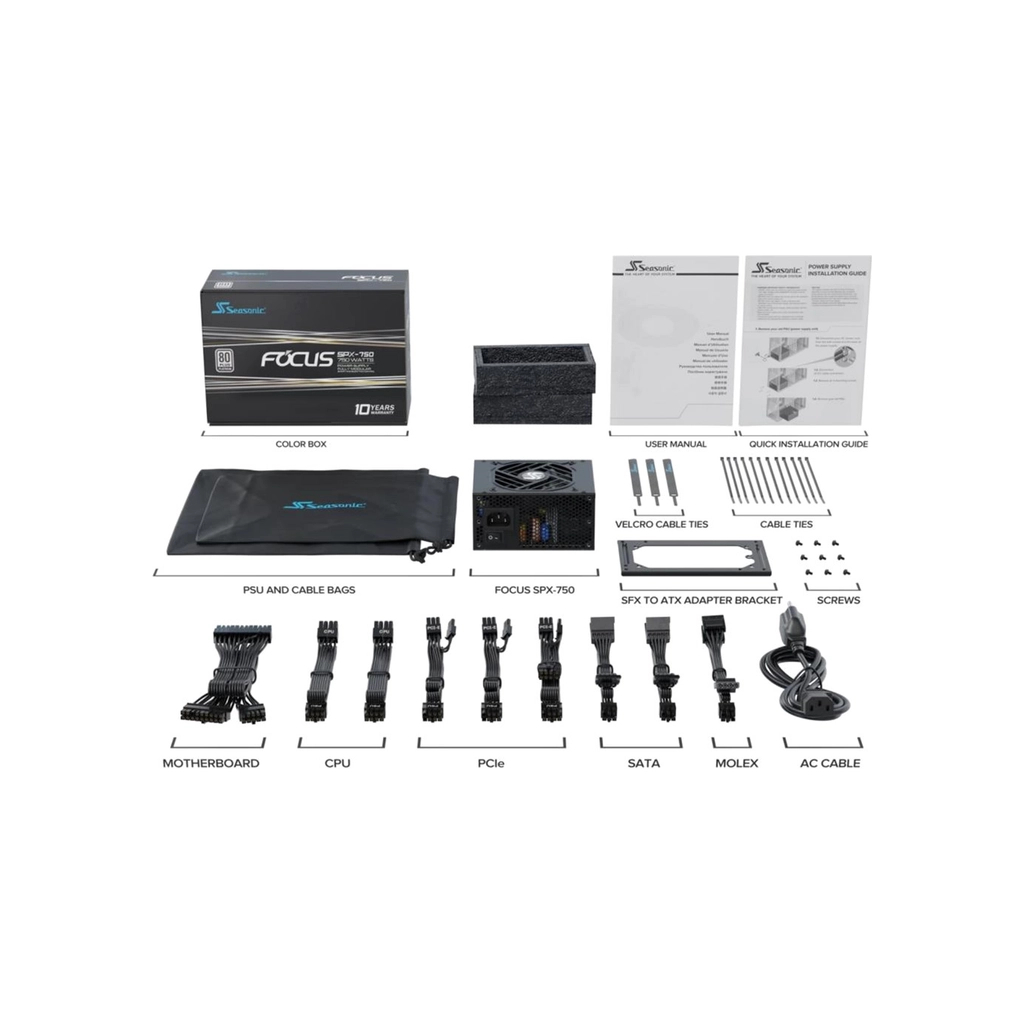 Блок живлення Seasonic 750W (FOCUS-SPX-750) є втіленням надійності та інноваційних рішень у компактному форматі. Цей потужний і в той же час невеликий комп'ютерний блок живлення призначений для стандарту SFX, що дозволяє встановлювати його навіть у найкомпактніші корпуси. Однак, завдяки комплектному кронштейну-перехіднику, він також сумісний з більшими ATX-корпусами, забезпечуючи додатковий простір для оптимального повітряного потоку.