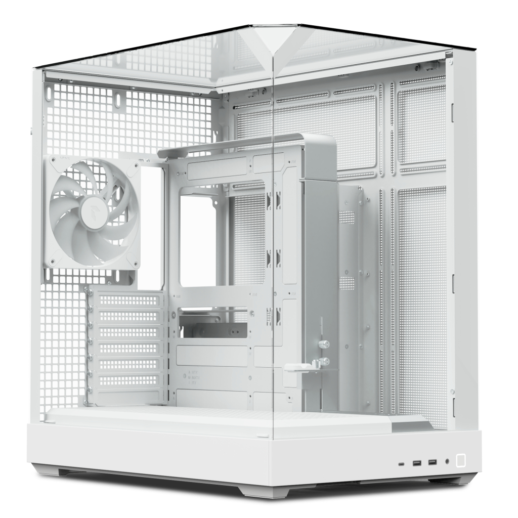 Елегантний білий дизайн корпусу доповнюється панорамним видом через три знімні панелі із загартованого скла. Цей стильний елемент дає змогу не тільки милуватися внутрішніми компонентами, але й демонструвати красиве RGB-підсвічування. Зручність використання підвищують зовнішні роз'єми: один USB Type C, два USB 3.0 та аудіовиходи, що забезпечують швидкий доступ до підключення периферійних пристроїв.