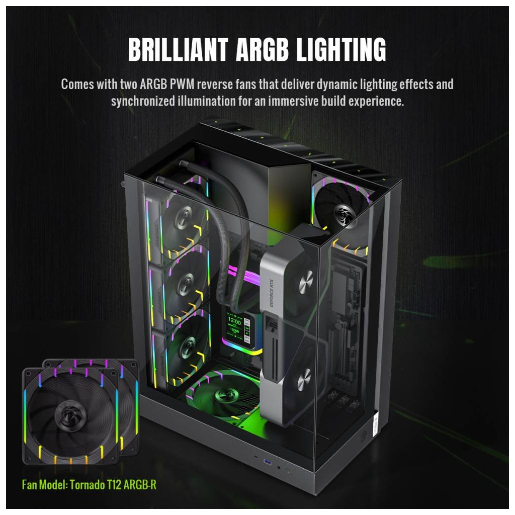 - Включає два вентилятори ARGB PWM для динамічних, синхронізованих світлових ефектів.