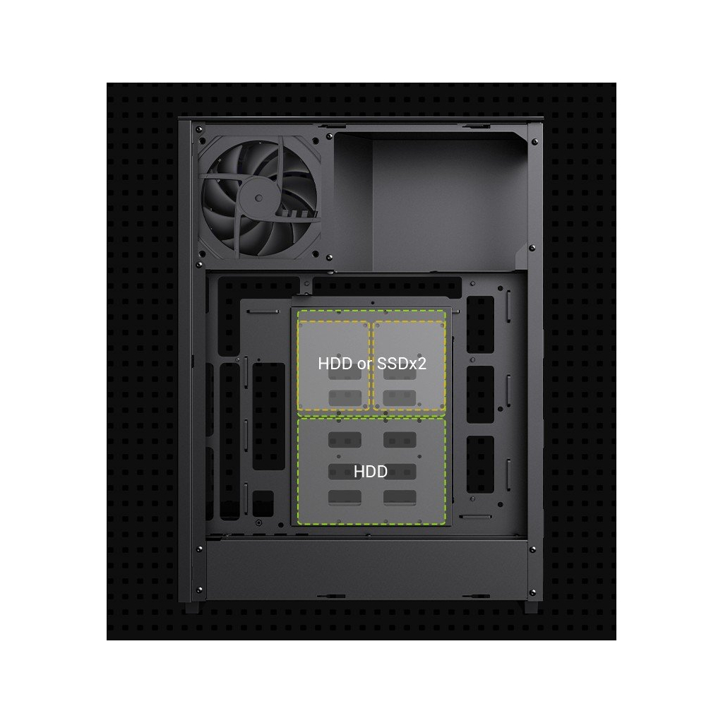 - Ефективна компактна конструкція підтримує 360-мм рідинне охолодження, материнські плати M-ATX та блоки живлення SFX.
