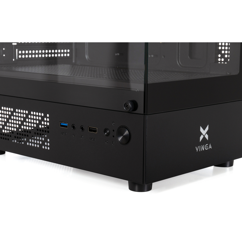 На зовнішній панелі корпусу розміщені всі необхідні роз'єми для швидкого підключення периферії: один USB 2.0, один USB 3.0 для швидкої передачі даних, а також два аудіороз'єми для підключення навушників і мікрофона. Завдяки прозорій передній панелі та вікну на бічній панелі корпус Vinga CS319B дозволяє бачити внутрішні компоненти системи і насолоджуватися красою їх підсвічування.
