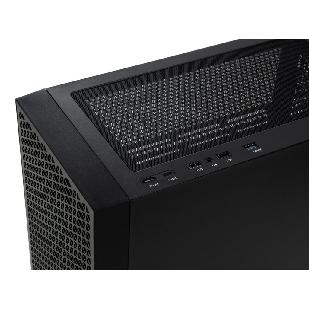На передній панелі корпусу розташовані різноманітні зовнішні роз'єми, включаючи два порти USB 1.0, два порти USB 3.0 та роз'єми для аудіовходу та виводу. Це забезпечує зручний доступ до підключення периферійних пристроїв без необхідності додаткових адаптерів.