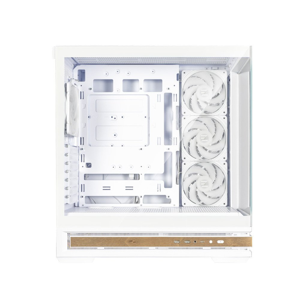 Панорамний корпус Zalman P40 NAMU WHITE для сучасної домашньої або ігрової станції, сумісний з актуальними компонентами та адаптований для BTF материнських плат. Передня та бічна панелі із загартованого скла. Додатковий дизайнерський елемент конструкції – вставка із натурального дерева по периметру корпусу. Забезпечено активне обдування компонентів за рахунок перфорації металевої поверхні панелей корпусу. Продумано захист від пилу. У комплекті 4 х 120мм ARGB вбудованих вентиляторів, концентратор та тримач для відеоадаптера. Вентилятори на бічній панелі – реверсні: забезпечують приплив повітря ззовні. Вентилятор на задній панелі працює на видуві. Корпус укомплектований усіма необхідними деталями для складання та подальшої експлуатації, є стандартні сучасні актуальні інтерфейси та роз'єми.