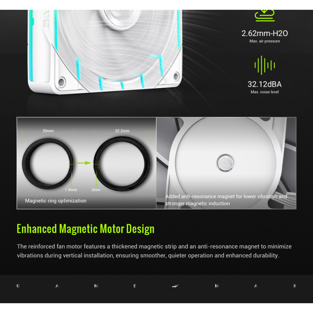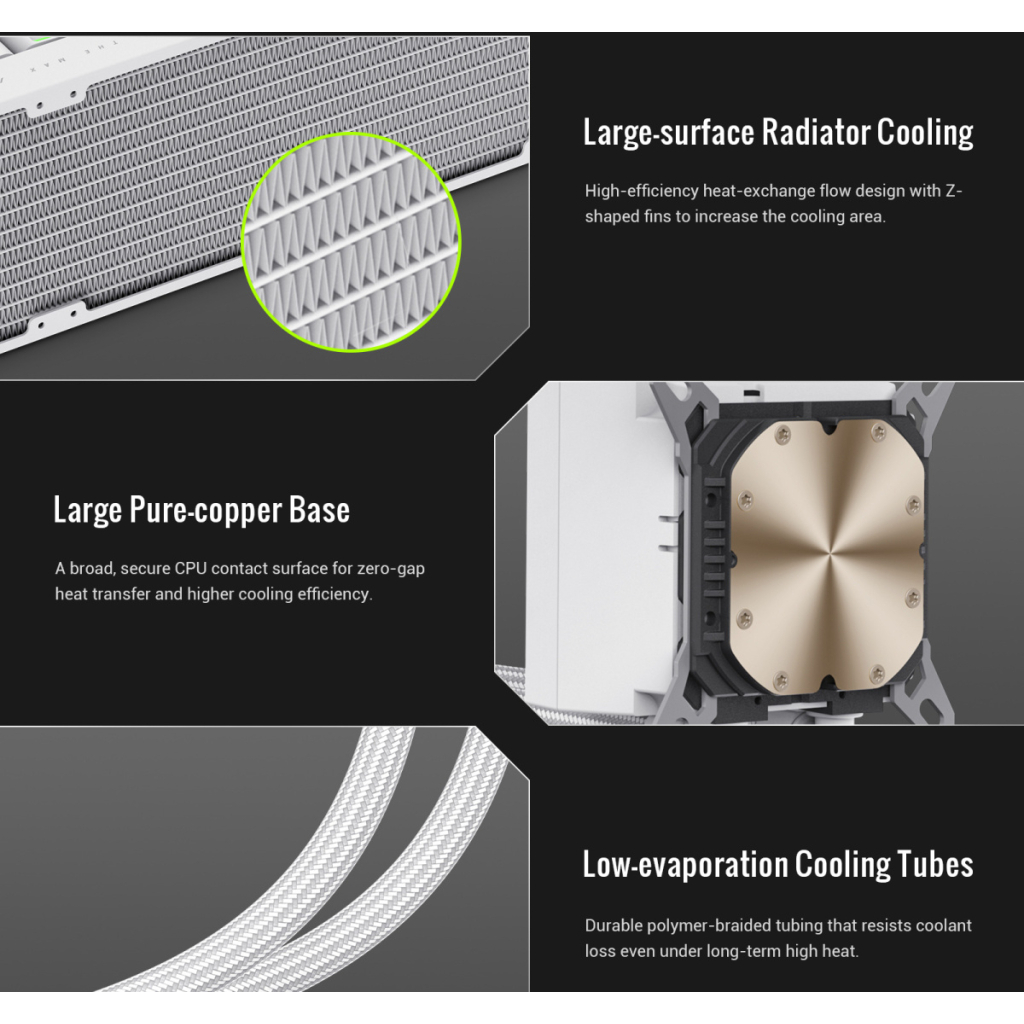 сокет - AM4, AM5, 1200, 1366, 1700, 1851, 2011, матеріал радіатора - алюміній, діаметр вентиляторів - 120 мм, рівень шуму - 30 dB, Підсвічування - RGB