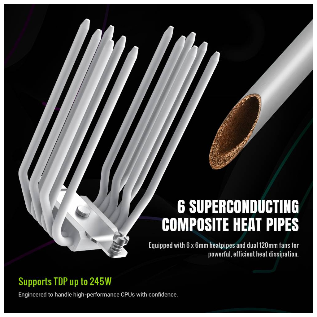 SIGMA 620 WH — це потужний баштовий кулер для процесора, створений для ефективного охолодження сучасних високопродуктивних CPU. Завдяки двом 120-мм вентиляторам, шести тепловим трубкам і підтримці TDP до 245 Вт він забезпечує стабільну роботу системи навіть під максимальним навантаженням, поєднуючи продуктивність із яскравим дизайном.