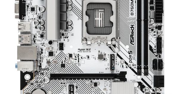 сокет - 1700, чіпсет - Intel B760, DDR5, макс. об'єм оперативної пам'яті - 96 ГБ, макс. частота оперативної пам'яті - 7200 MHz, швидкість LAN - 2,5 Гбіт/с, D-Sub (VGA), DisplayPort, HDMI, внутрішні - 1 x M.2 2230 WiFi/BT, 4 x Sata 6.0 Gb/s, Micro-ATX