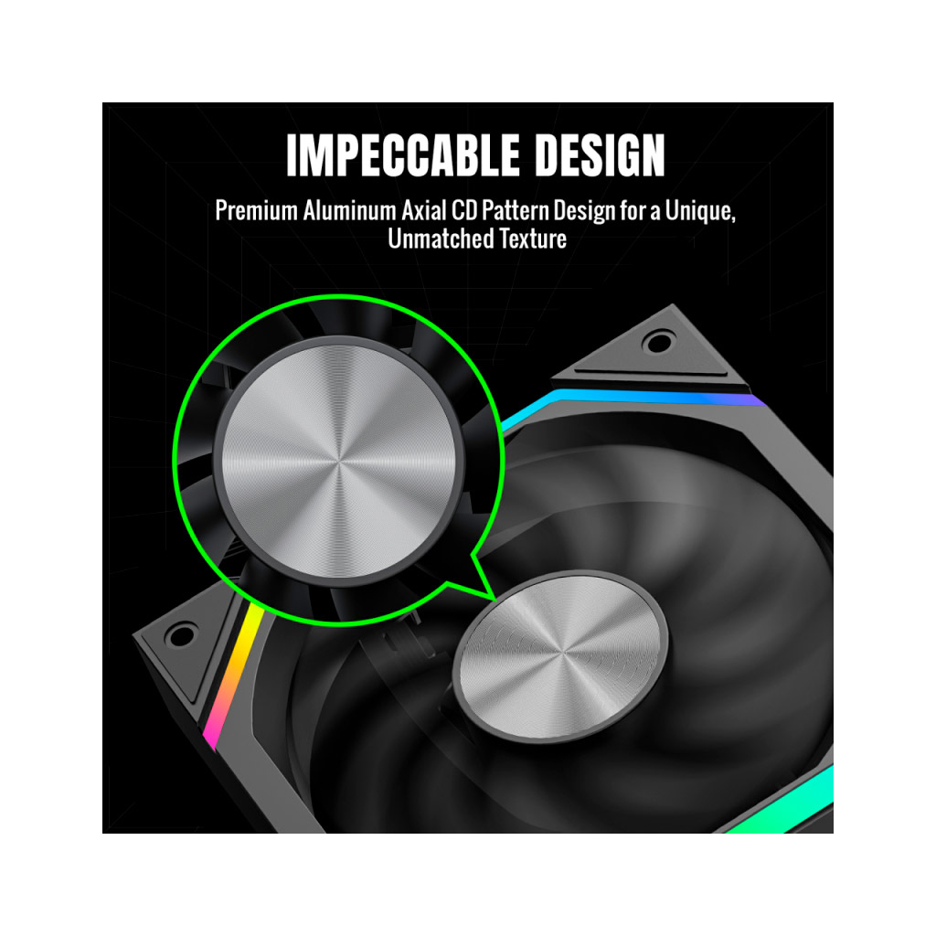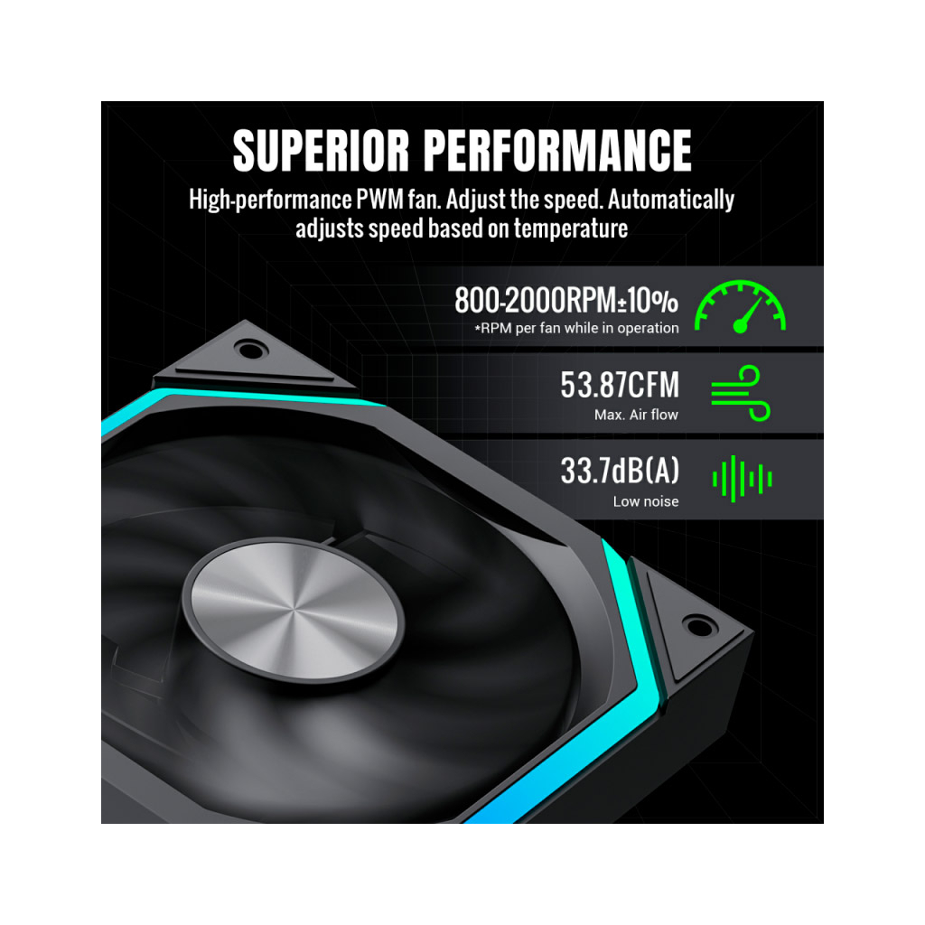 Завдяки 9-лопатевій конструкції вентилятор оптимізує потік повітря, а підтримка PWM-контролю дає змогу автоматично регулювати швидкість обертання в діапазоні 800-2000 об/хв залежно від температури системи, що забезпечує баланс між продуктивністю та енергоефективністю. Однією з ключових особливостей вентилятора є його гідравлічні підшипники, які гарантують тиху роботу навіть під час інтенсивних навантажень. Рівень шуму не перевищує 33,7 дБ, що дозволяє насолоджуватися комфортною тишею під час роботи чи гри.