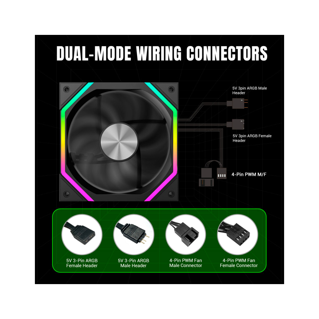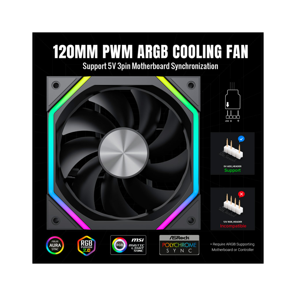Вентилятор доступний у чорному кольорі з реверсивними лопатями, що додає гнучкості під час монтажу та дозволяє адаптувати його до різних конфігурацій корпусу. GameMax FN12A-N2-R підтримує синхронізацію ARGB-підсвічування з материнськими платами ASUS, MSI та іншими через 5V 3-контактний роз’єм. Це дозволяє створювати динамічні світлові ефекти, які ідеально доповнять зовнішній вигляд вашого ПК.