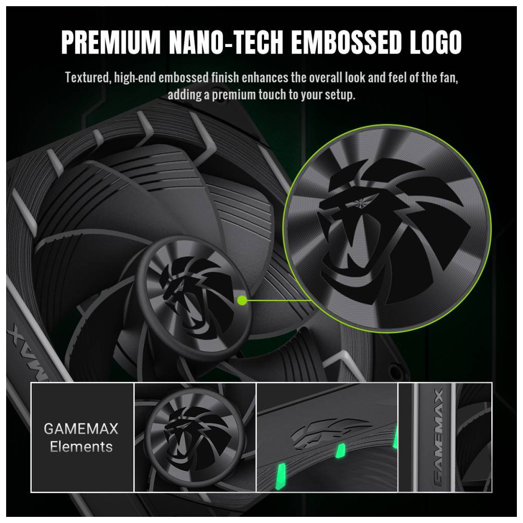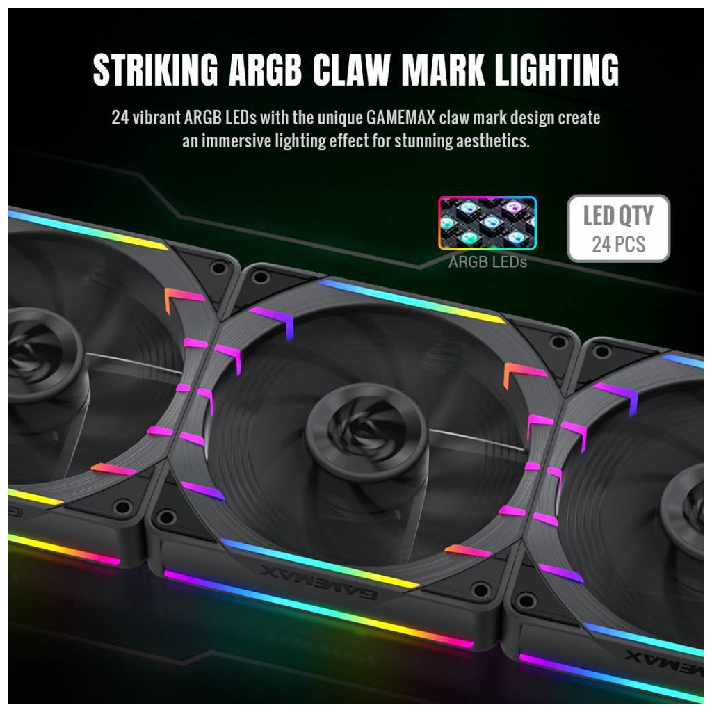 Приголомшливе ARGB-підсвічування: 24 ARGB-світлодіоди створюють унікальний ефект сліду кігтя GameMax. Підтримує синхронізоване регулювання підсвічування з материнською платою, додаючи естетики кіберспорту до вашого корпусу ПК.