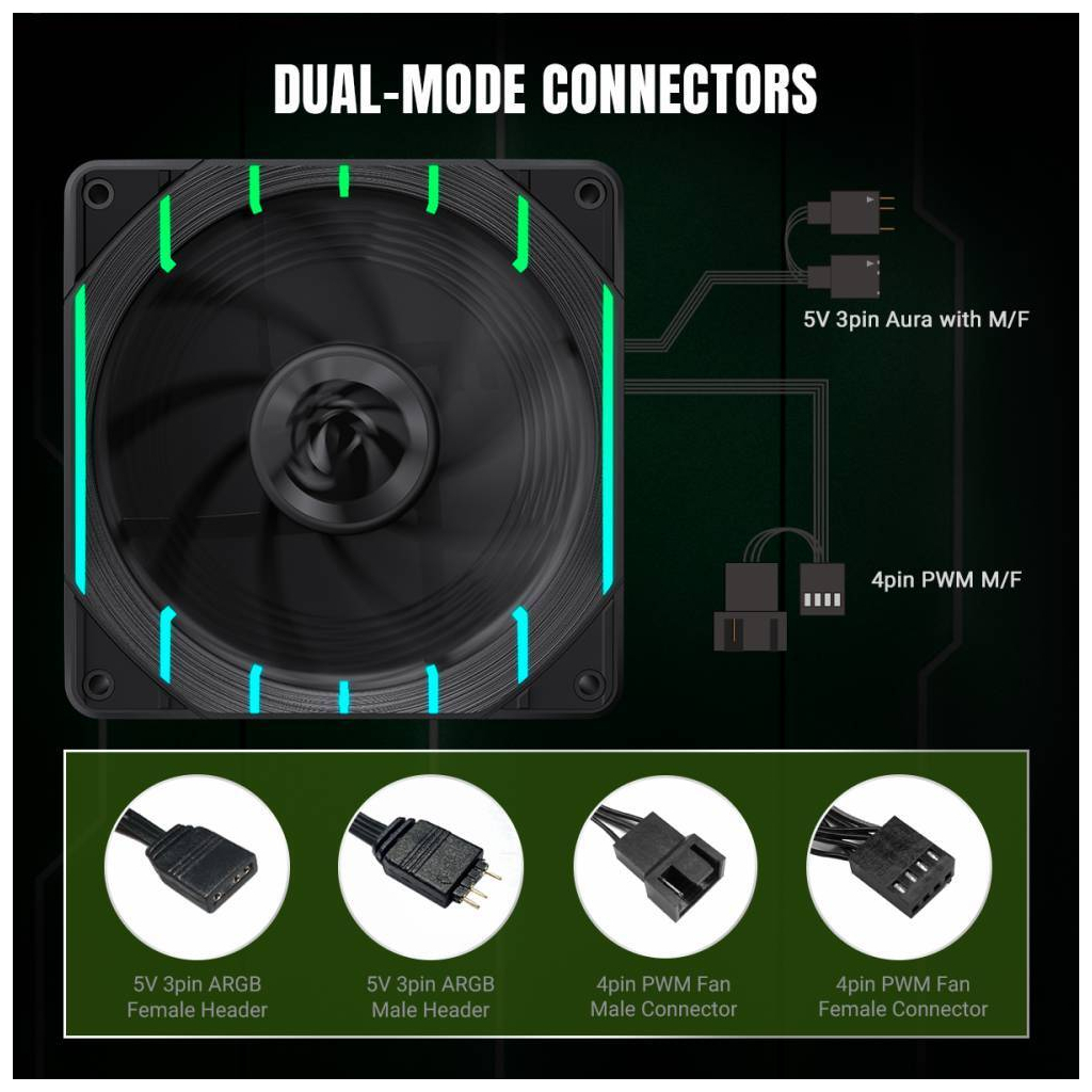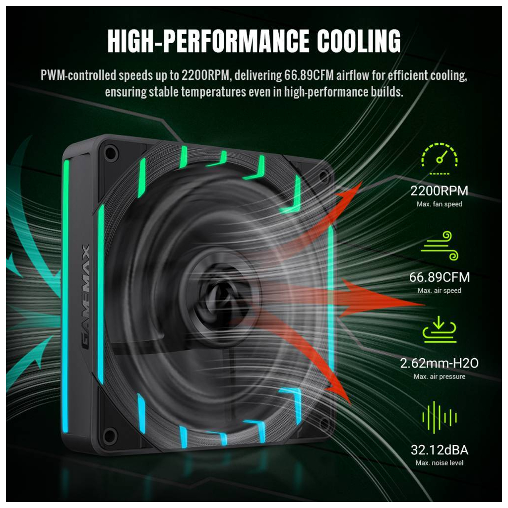 Кількість вентиляторів - 1, діаметр вентиляторів - 120 мм, тип підшипника - FDB Bearing (гідродинамічний), 2200RPM, тип роз'єму підключення - 3-pin, 4-pin, Підсвітка - ARGB, рівень шуму - 32.12 дБ