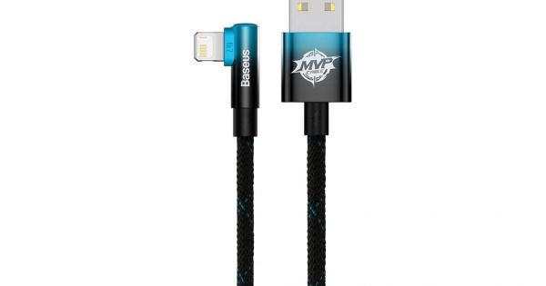 Тип - кабель, Тип конектора 1 - USB 2.0 (AM), Тип конектора 2 - Lightning, довжина - 2 м, Номінальний струм - 2.4 А, нейлонове покриття, кутовий коннектор, Колір - синьо-чорний..