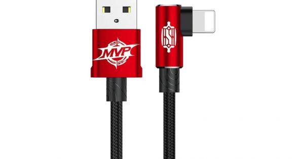 Тип - кабель, Тип конектора 1 - USB 2.0 (AM), Тип конектора 2 - Lightning, довжина - 2 м, Номінальний струм - 2.4 А, нейлонове покриття, кутовий коннектор, Колір - червоно-чорний