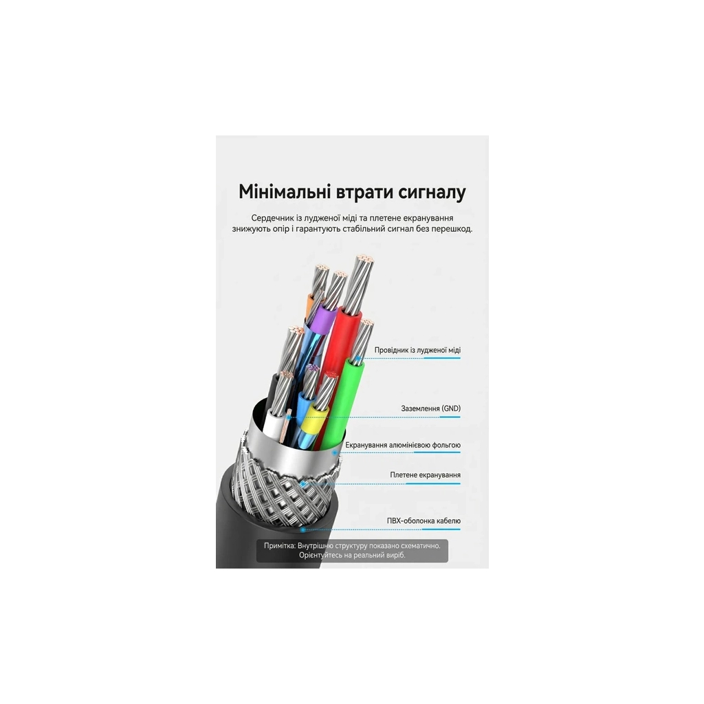 - Високоякісні матеріали та надійне екранування: Кабель виготовлено з використанням сердечника з лудженої міді, що має низький електричний опір та високу провідність. Для захисту від електромагнітних перешкод та радіочастотних завад застосовано багатошарове екранування, яке складається з алюмінієвої фольги та щільного металевого обплетення, доповнених заземлюючим провідником. Зовнішня оболонка виконана з міцного та гнучкого ПВХ чорного кольору, а конектори мають нікельоване покриття, що захищає контакти від корозії та окислення, значно подовжуючи термін служби виробу навіть при інтенсивному використанні.