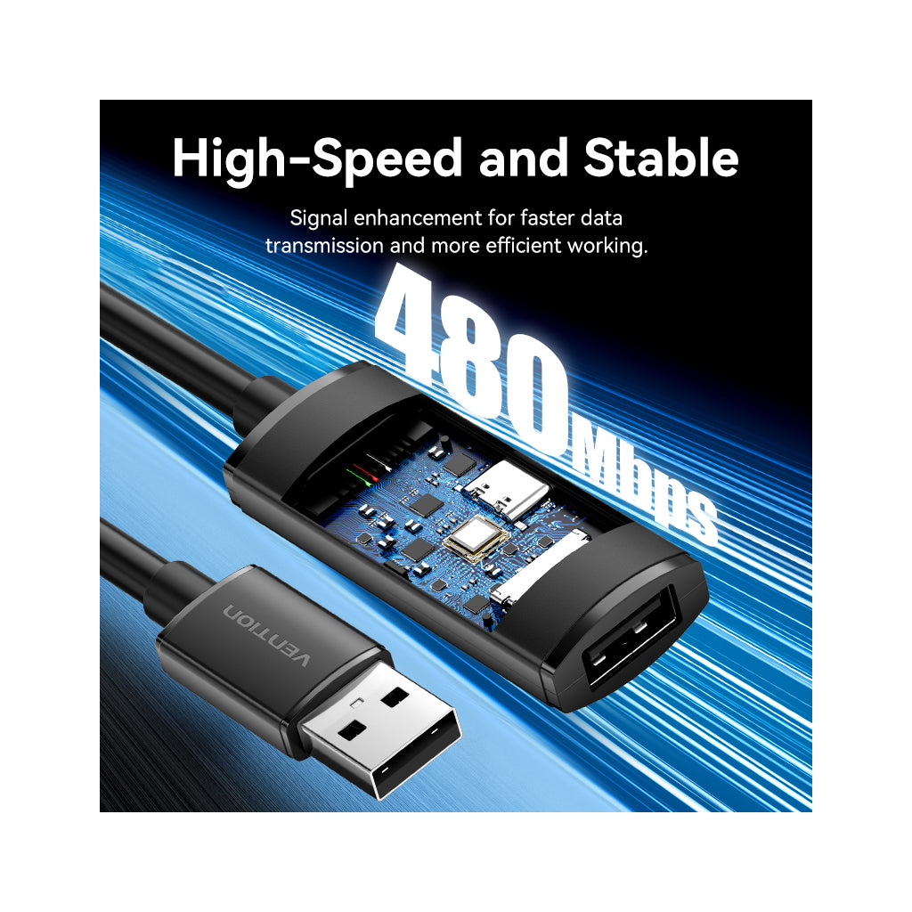VENTION USB 2.0 Active Extension Cable 5m - дата-кабель/активний подовжувач USB 2.0 A-Male (AM) → USB 2.0 A-Female (AF) довжиною 5 метрів, чорний, модель CBKBJ від VENTION.