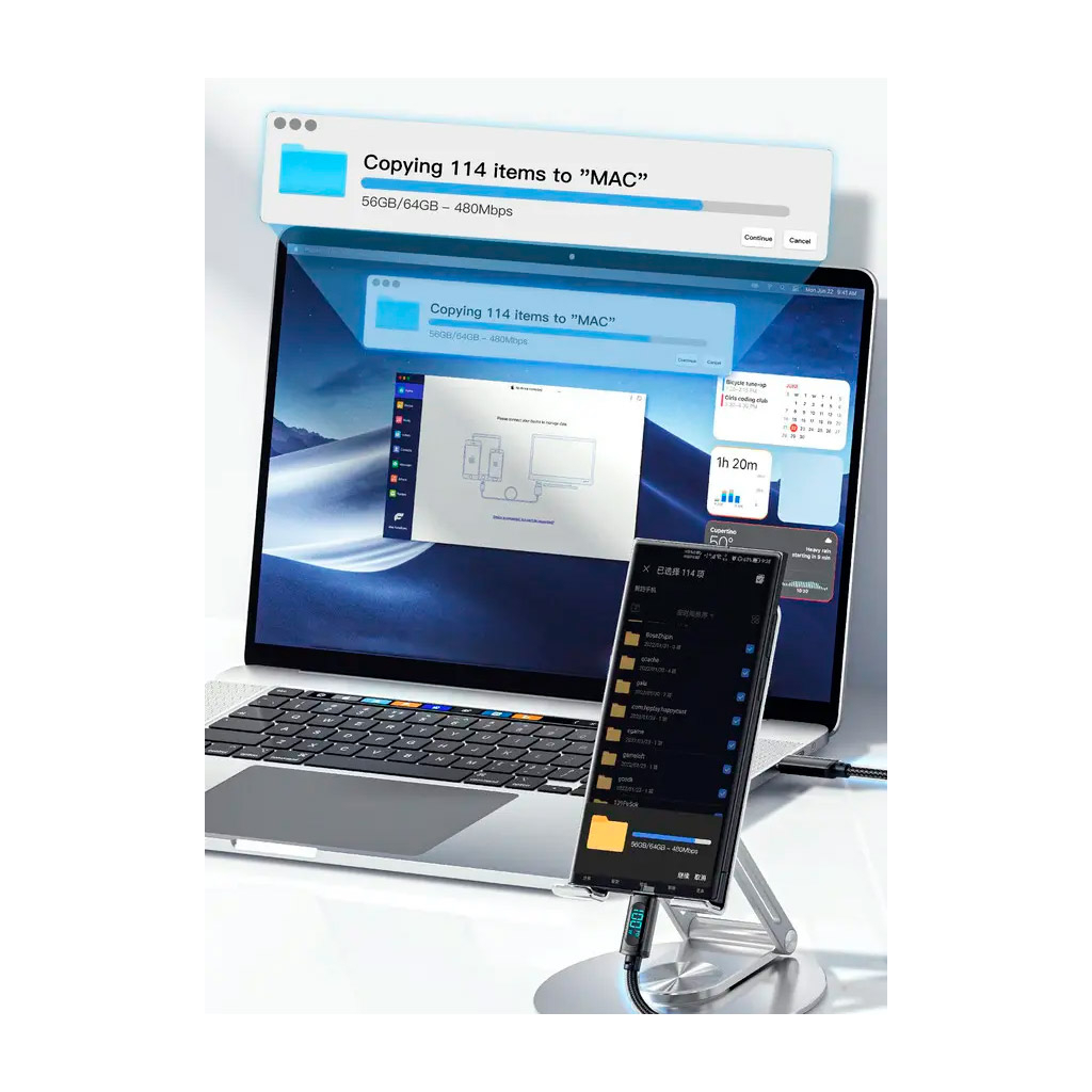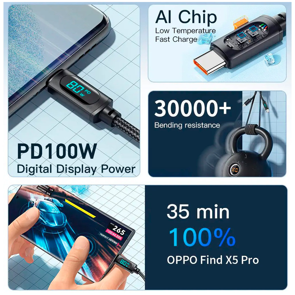 | Особливості | тканинне обплетення, нейлонове покриття, максимальна швидкість передачі даних: 480 МБ/с, LED-індикатор потужності заряду, Цифровий дисплей для контролю за споживаною потужністю |
