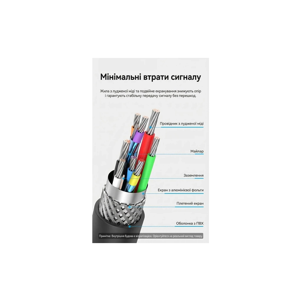 - Вдосконалена структура екранування: Внутрішня структура кабелю створена для протидії перешкодам та забезпечення чистоти даних. Вона використовує багатошаровий підхід до екранування, починаючи з серцевини з високоякісних провідників із лудженої міді, обгорнутих алюмінієвою фольгою, і додатково захищених щільною металевою плетеною сіткою та дротом заземлення. Це комплексне екранування блокує зовнішні електромагнітні перешкоди (EMI) та радіочастотні перешкоди (RFI), що призводить до стабільної передачі без статики або сигнального шуму, що особливо важливо в середовищах з великою кількістю бездротових сигналів.