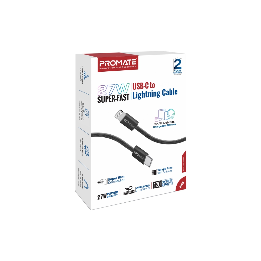 Тип - кабель, Тип конектора 1 - USB Type-C, Тип конектора 2 - Lightning, довжина - 1.2 м, Номінальний струм - 3 А, 27 W, Колір - чорний