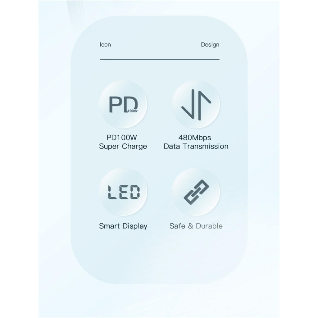 | Особливості | тканинне обплетення, швидка зарядка - Quick Charge, 100W, Відображення потужності в реальному часі: вихідна потужність відображається в режимі реального часу, дозволяючи дізнатися потужність заряджання та стан пристрою |